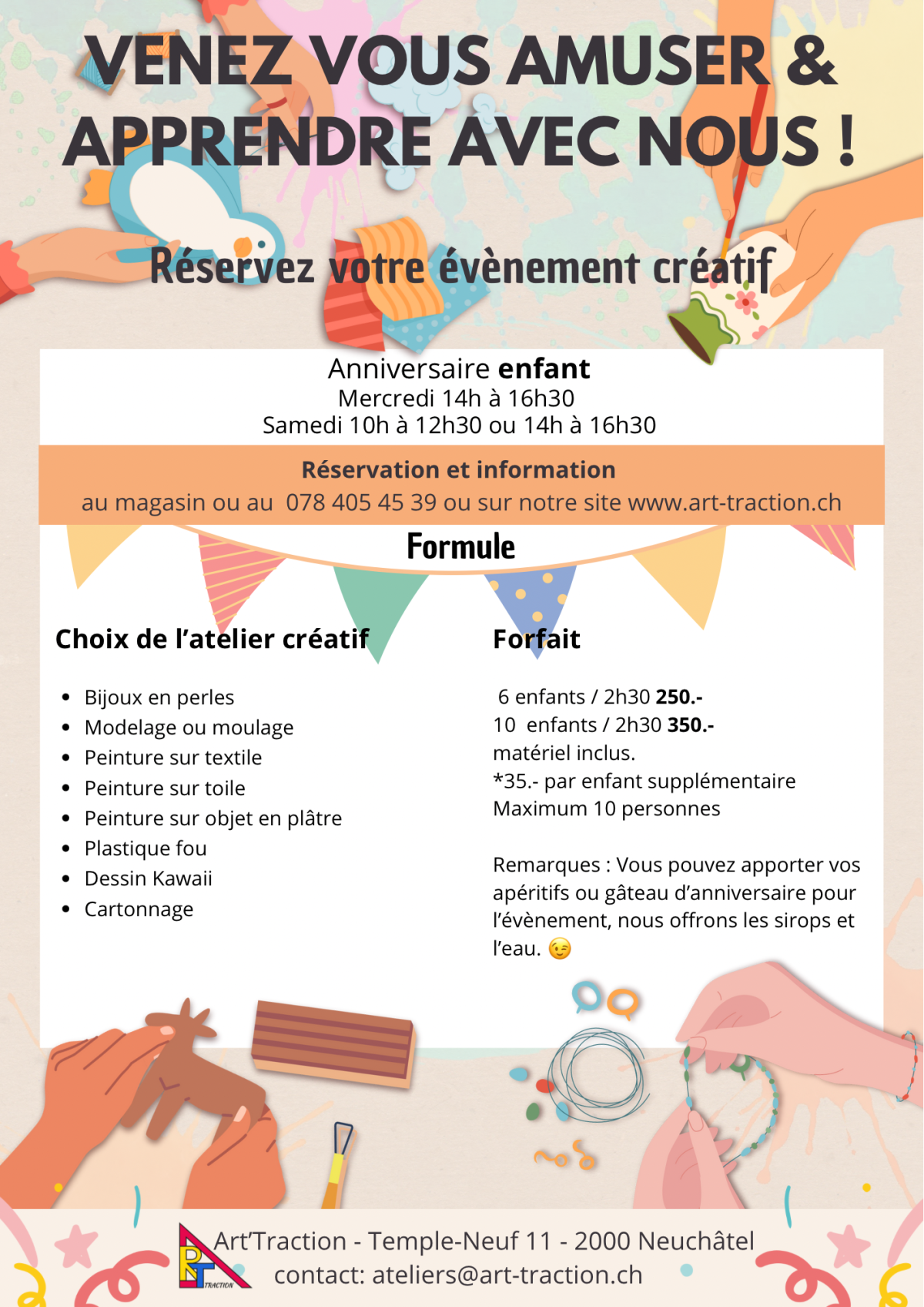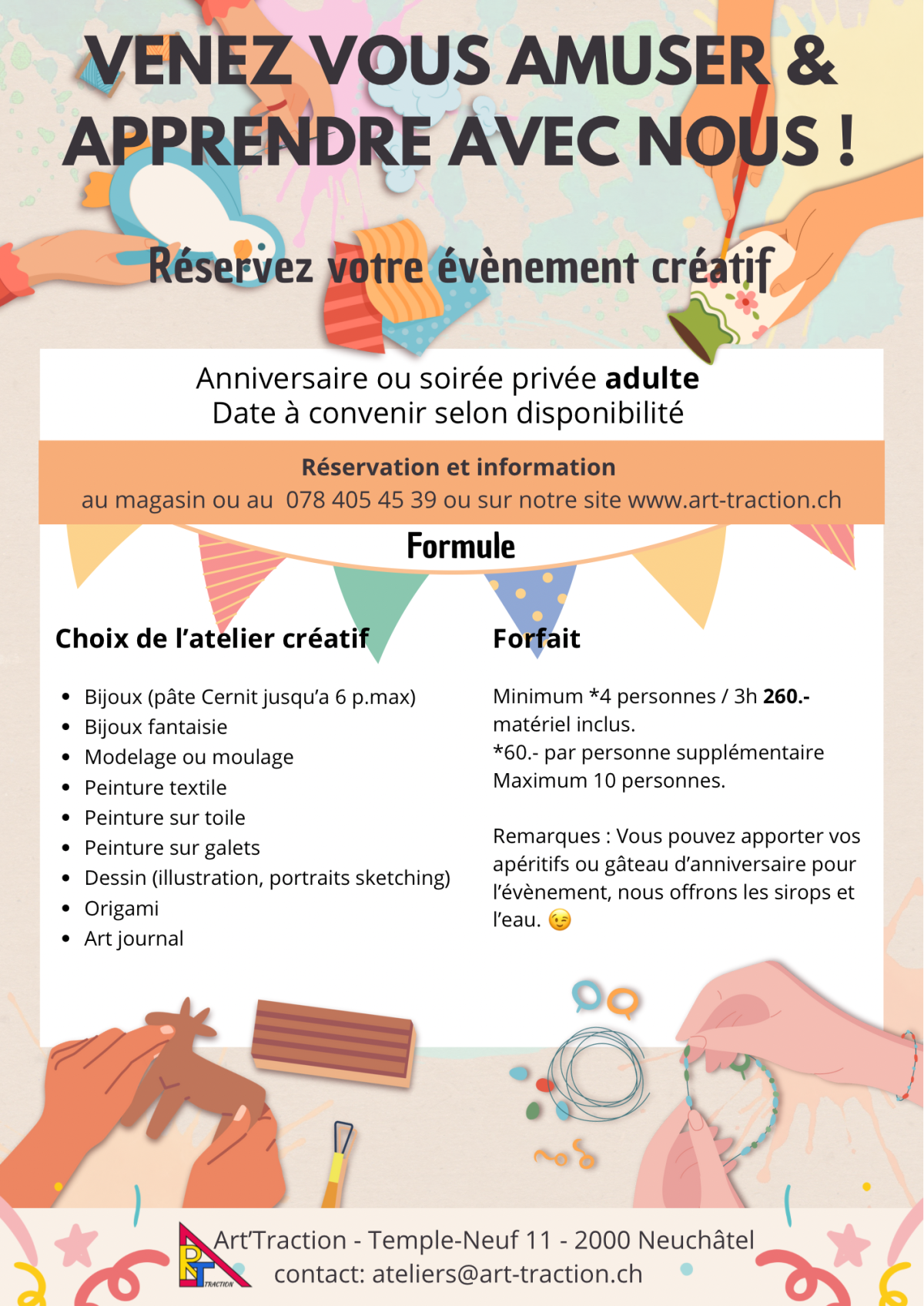Notre espace de créativité, Les Ateliers d’Art’traction vous propose des cours, des ateliers et des événements créatifs.
