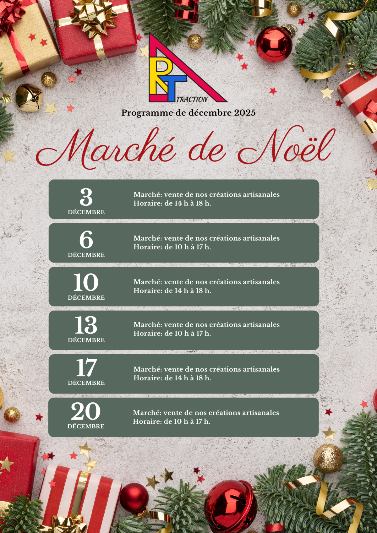 Décembre: Marchés de Noël 🎄 mercredi 3, 10, 17 de 14h à 18h et samedi 6, 13, 20 de 10h à 17h